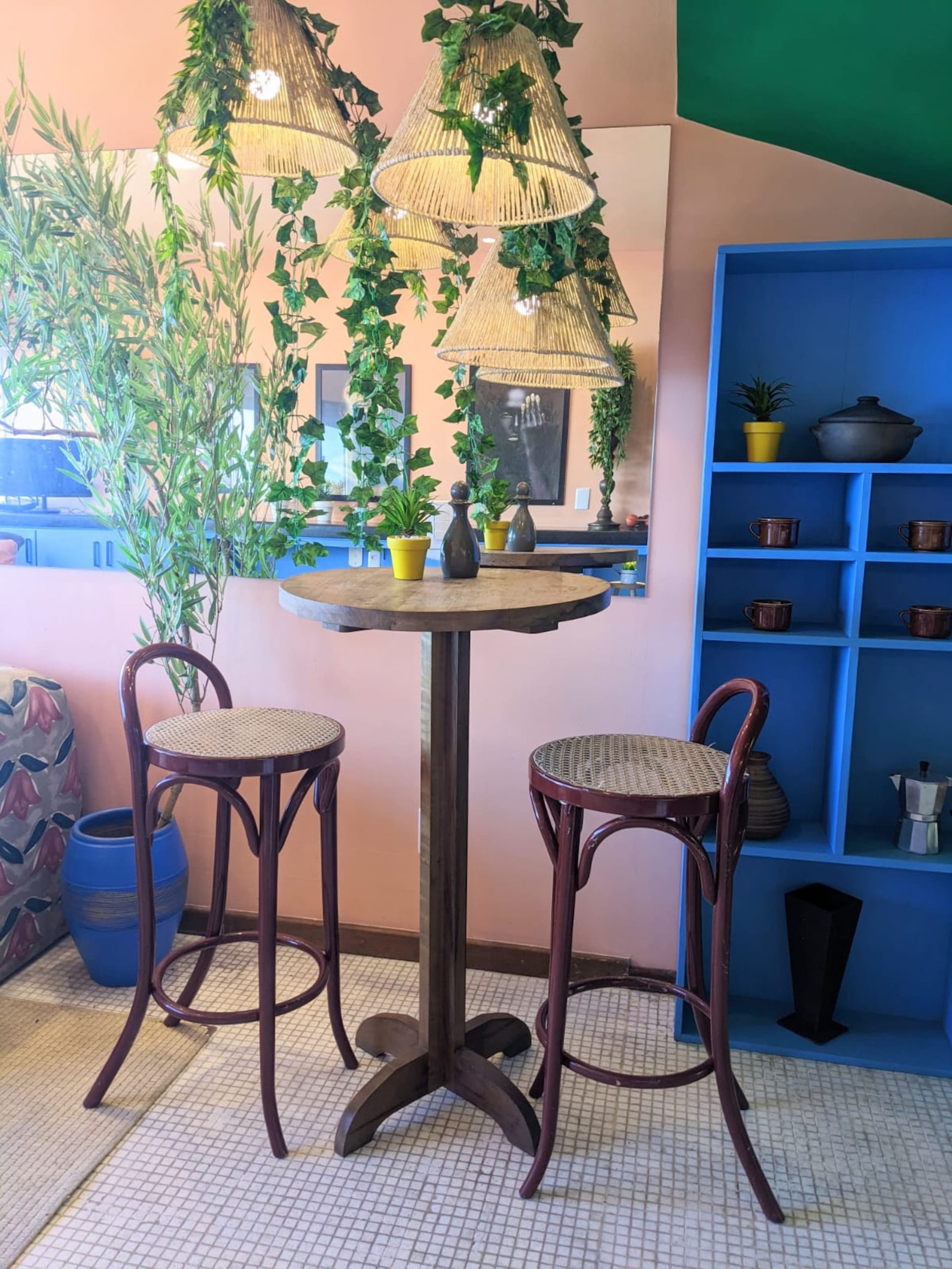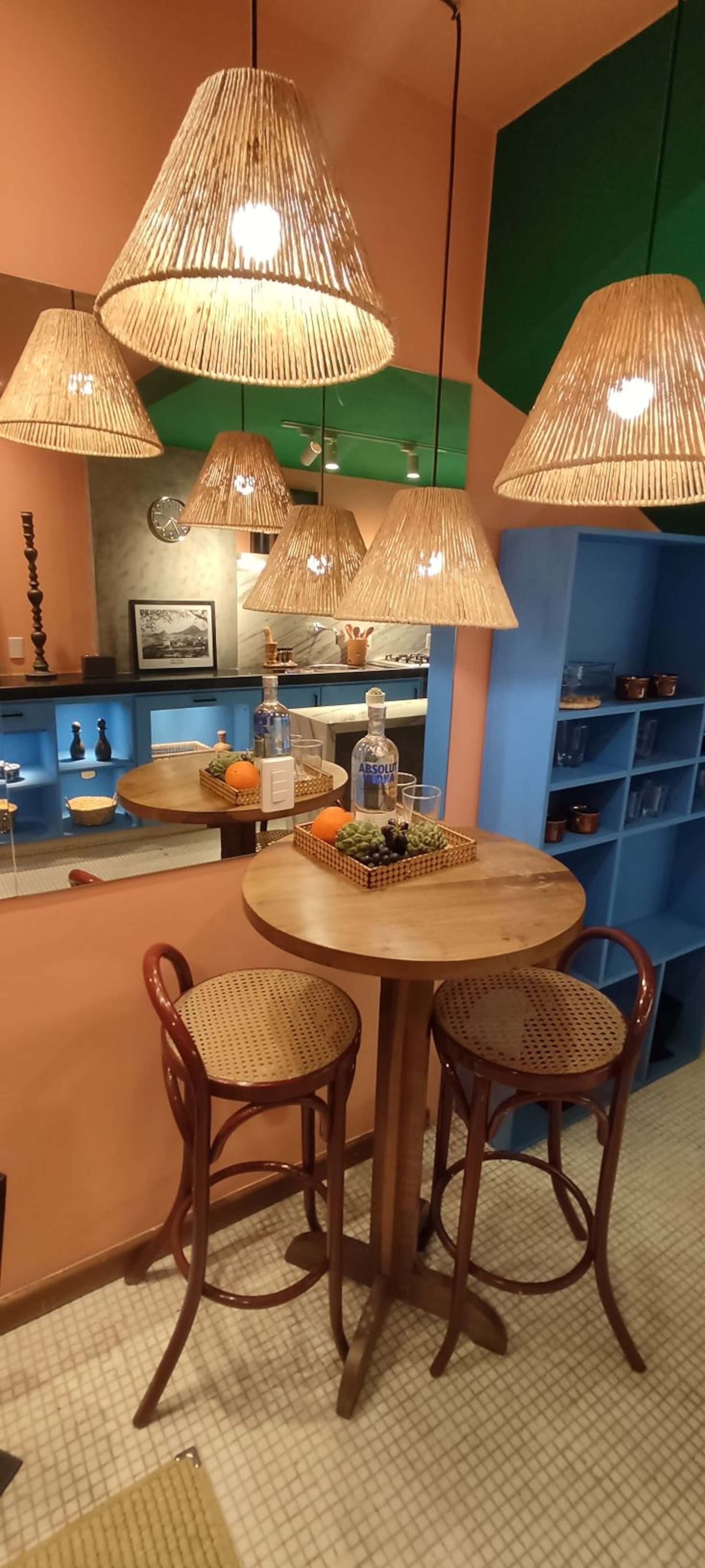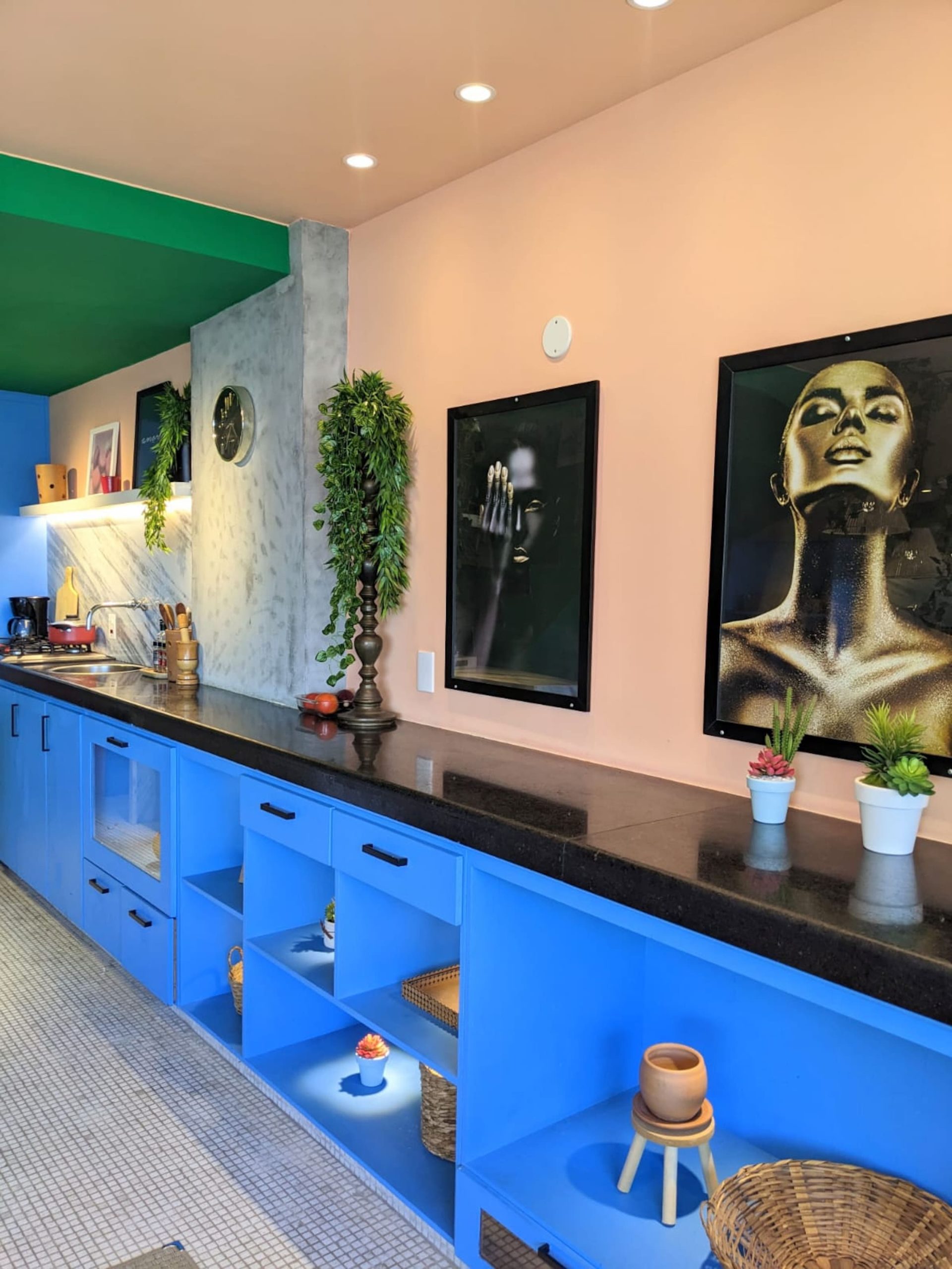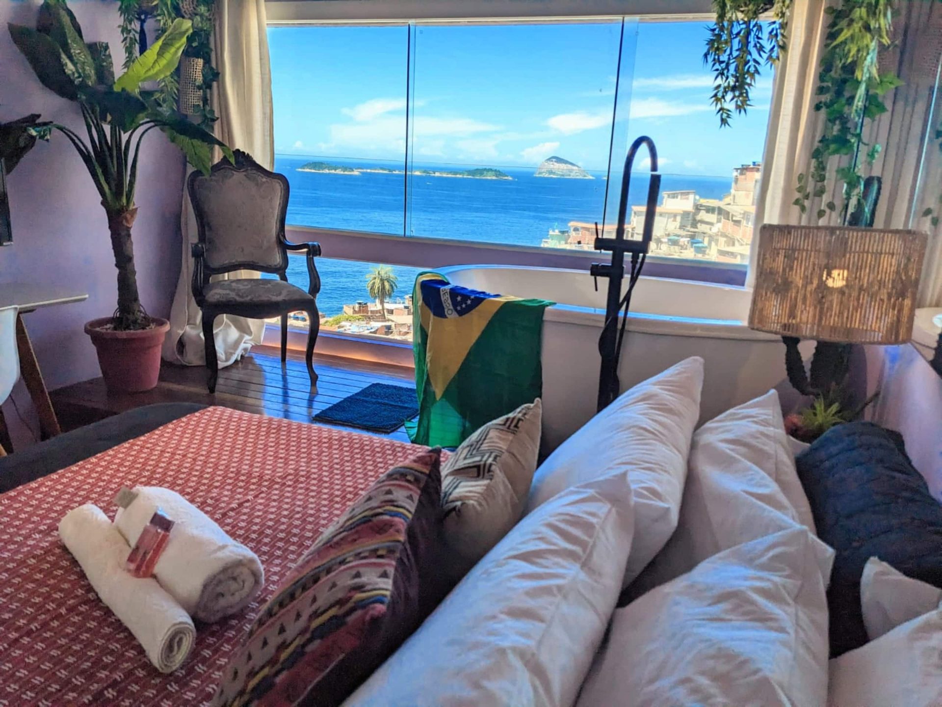 Seven hundred square feet spread across two floors inside a gated building with a daytime doorman, halfway up a hillside in Vidigal. Designed by a Los Angeles interior designer who believed the 360-degree view deserved better than beige. Magazine-featured. Solar-heated soaking tub. One 1920s Louis XV chair, restored. Two guests, one queen bed, zero elevator.