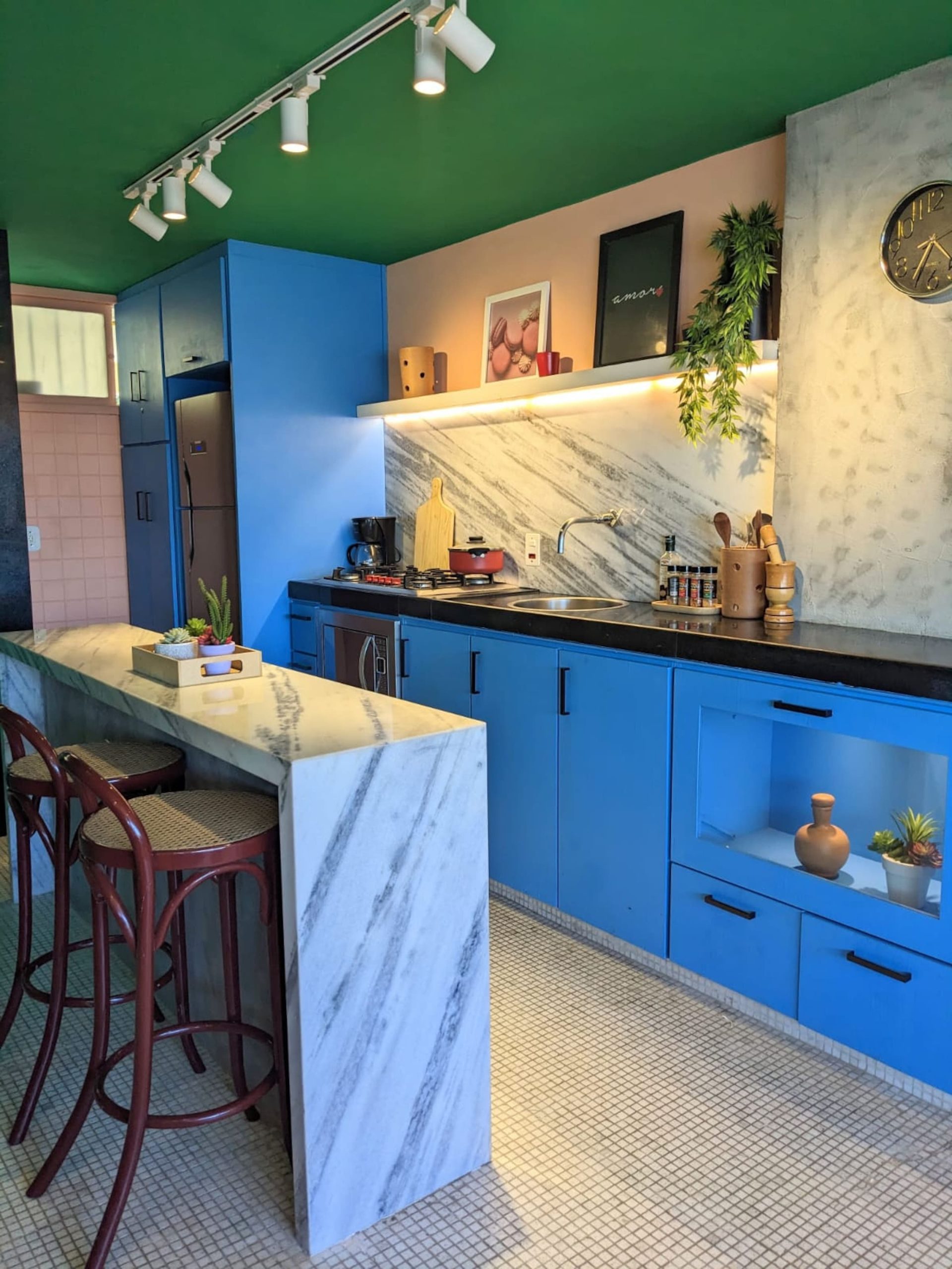 Behind the living area is the full gourmet kitchen: cobalt blue lower cabinets, a marble backsplash, a five-burner gas range, a French-door refrigerator, a coffee maker, a kettle, a toaster, an oven with a broiler, a microwave. It is a kitchen designed for the people who cook while on vacation, not because they must, but because they want to. Moqueca is recommended. Breakfast is essential — the morning light on the balcony is the reason people get up at six.